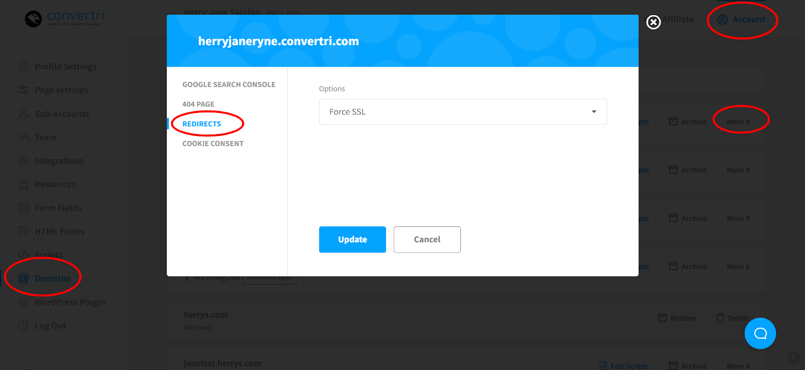 - Click the Redirect tab. Choose Force SSL from the dropdown menu.