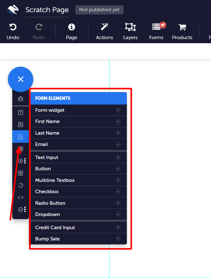 In the Elements Tray, click Form Elements. Drag over the number of form fields you require to match your Google Form, and add a Submit button.