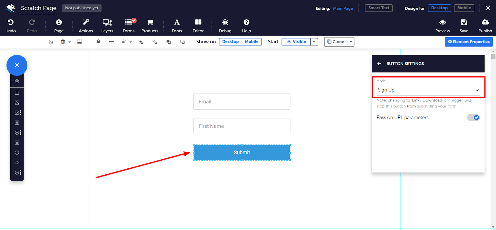 Select your Submit button, and in the Properties panel, head to Button Settings. Make sure the button mode is set to Sign Up.