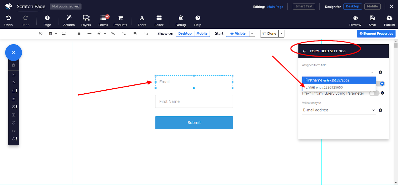 Next, select your first form input element, and in its Properties Panel, go to Input Properties, and change the placeholder text to what you require. Then, go to Form Field Settings. In the Assigned Form Field dropdown, choose the field from your Google Form to match, and choose if it’s Required (this makes sure responses get matched to the correct questions). If your text field is an email address, choose Email from the Validation dropdown, and this will make sure the text entered is a valid email.