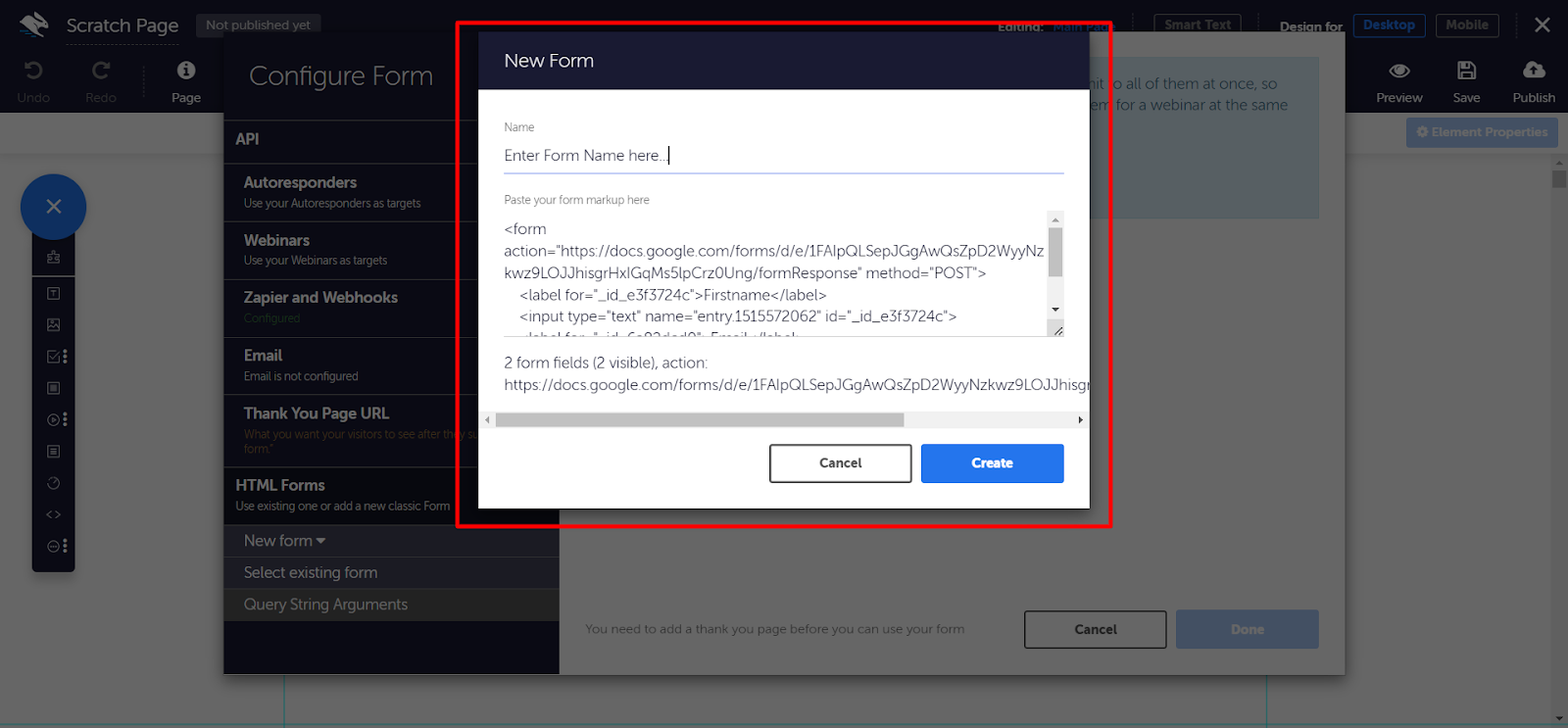 In the Page Builder, click Forms in the top toolbar. Then click HTML Forms in the left-hand menu, then New Form, then Google Form.