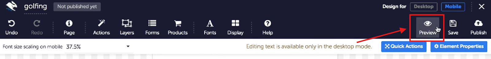 Important Note: The preview function shows how the page looks on the device you are currently using. If you click Preview while on a desktop computer, even if you are currently editing in mobile view, you will see the desktop version of the page. To see the mobile version, you must view the preview on a mobile device or use browser developer tools to simulate a mobile screen.